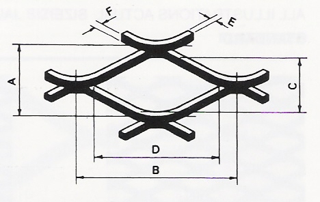 A - Center to Center of SWD B - Center to Center of LWD C - Size of opening SWD D -Size of opening LWD E - Thickness of strand F - Width of strand |